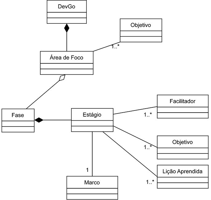 O DevGo, como indicado na Figura 17, é composto por áreas de foco, que indicam as áreas que uma organização central precisa cuidar para governar desenvolvedores e manter padrões. Cada área de foco possui, pelo menos, um objetivo organizacional. Uma área de foco pode ser composta por fases. Cada uma destas fases está relacionada à mudança no fluxo de avanço do desenvolvedor dentro do ecossistema que é impulsionada por um conjunto de passos a serem dados.